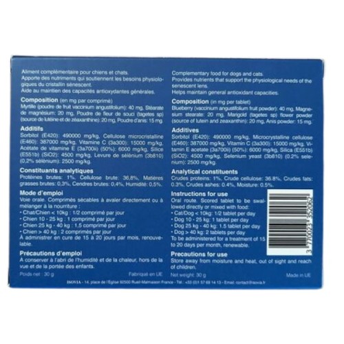 Supplément nutritionnel destiné au soutien de la fonction visuelle et de la santé oculaire chez le chien et le chat.